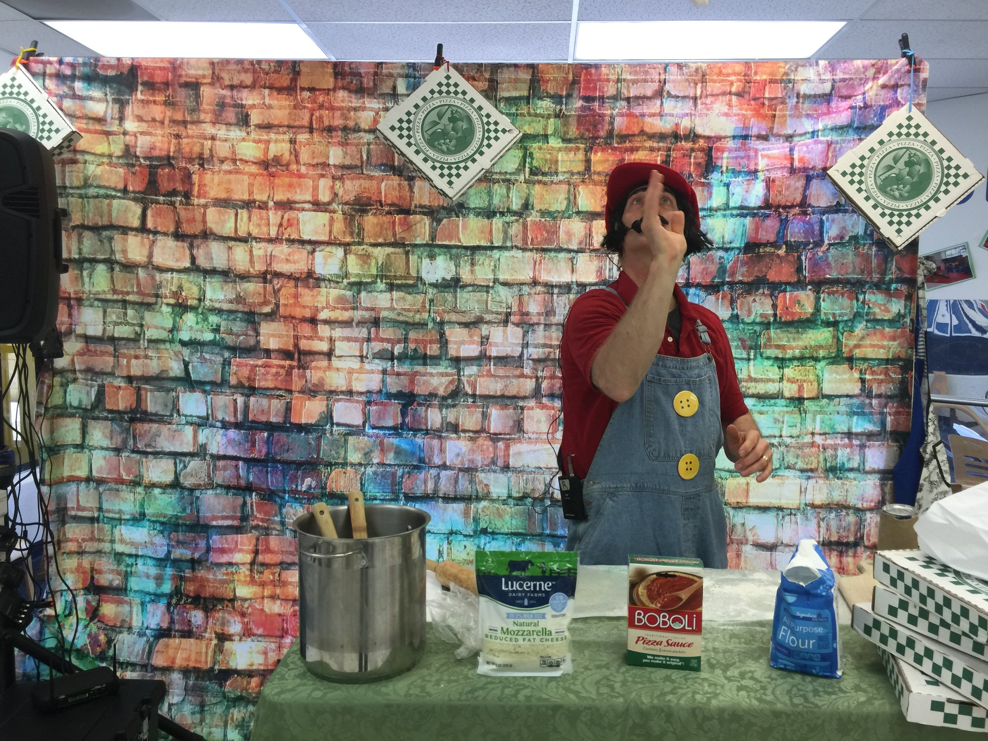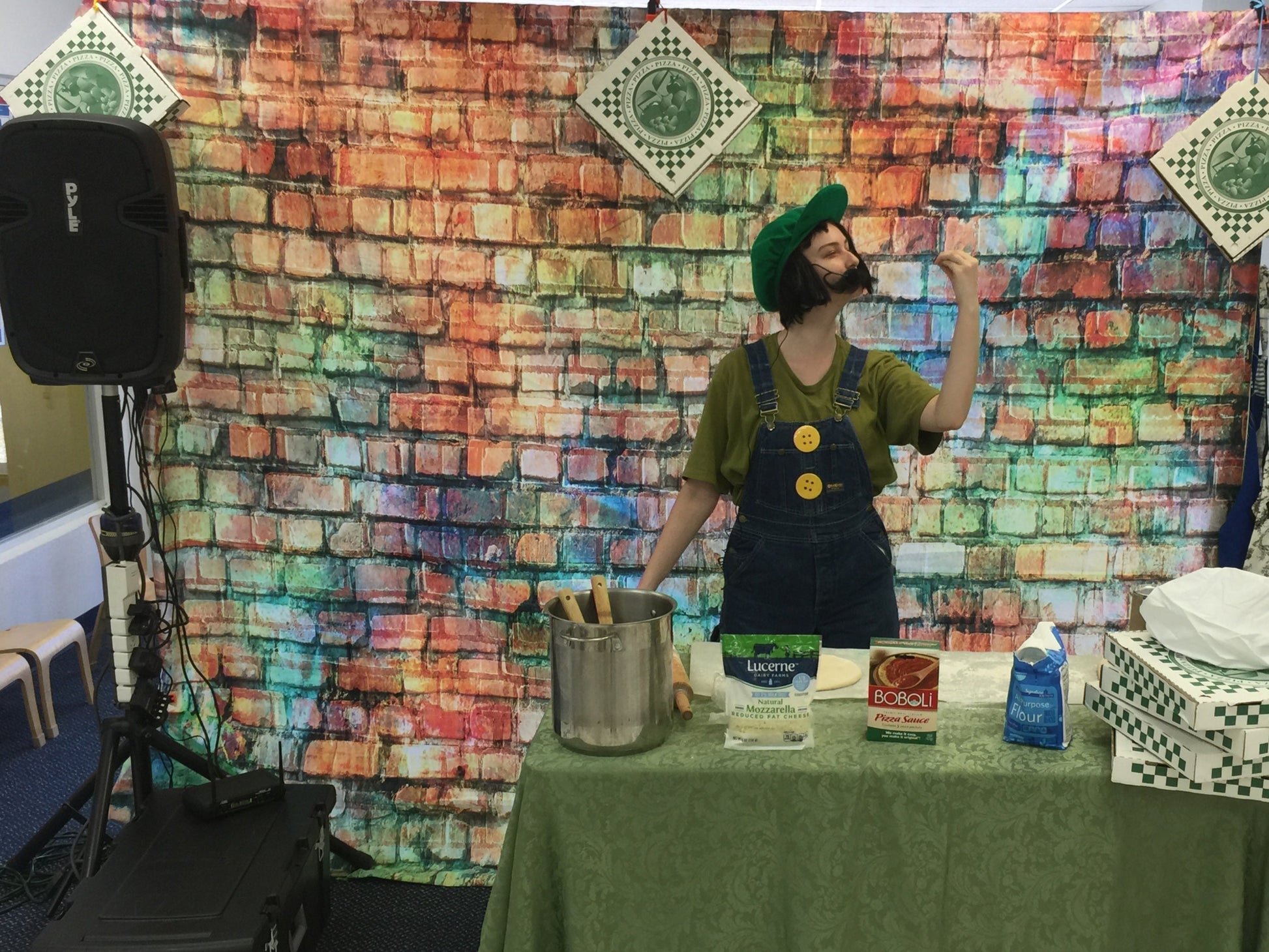 - 2 performers (Mario & Luigi), Italian kitchen décor (table, pots, flowers, signage)