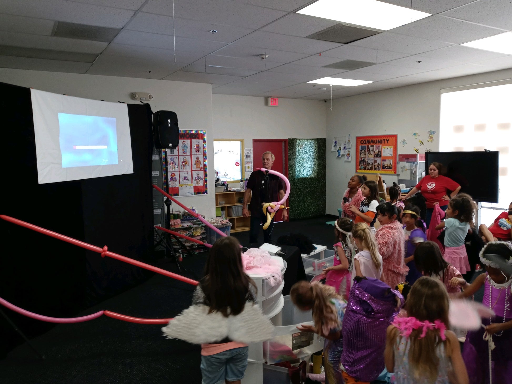 - Party backdrop + cinema screen (top-center)